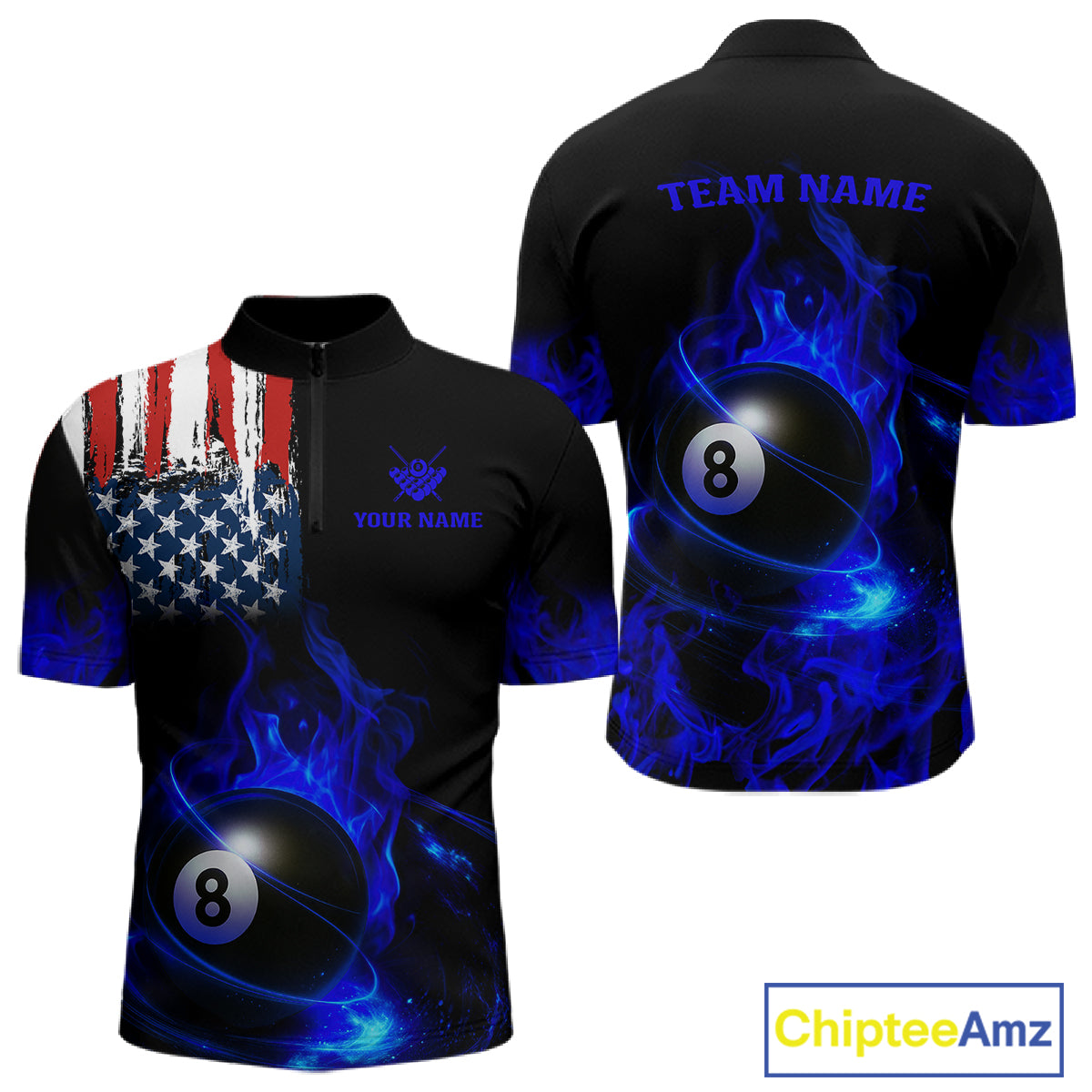 Blue Flaming American Flag 8 Ball Billiard Shirt For Men Custom Patriotic Pool Team Jersey TDM4842