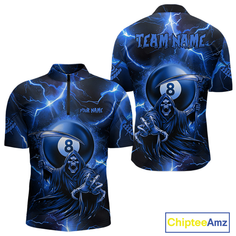 Personalized Blue Grim Reaper 8 Ball Men's Billiard Shirt Custom Thunder Lightning Pool Team Jersey TDM4873