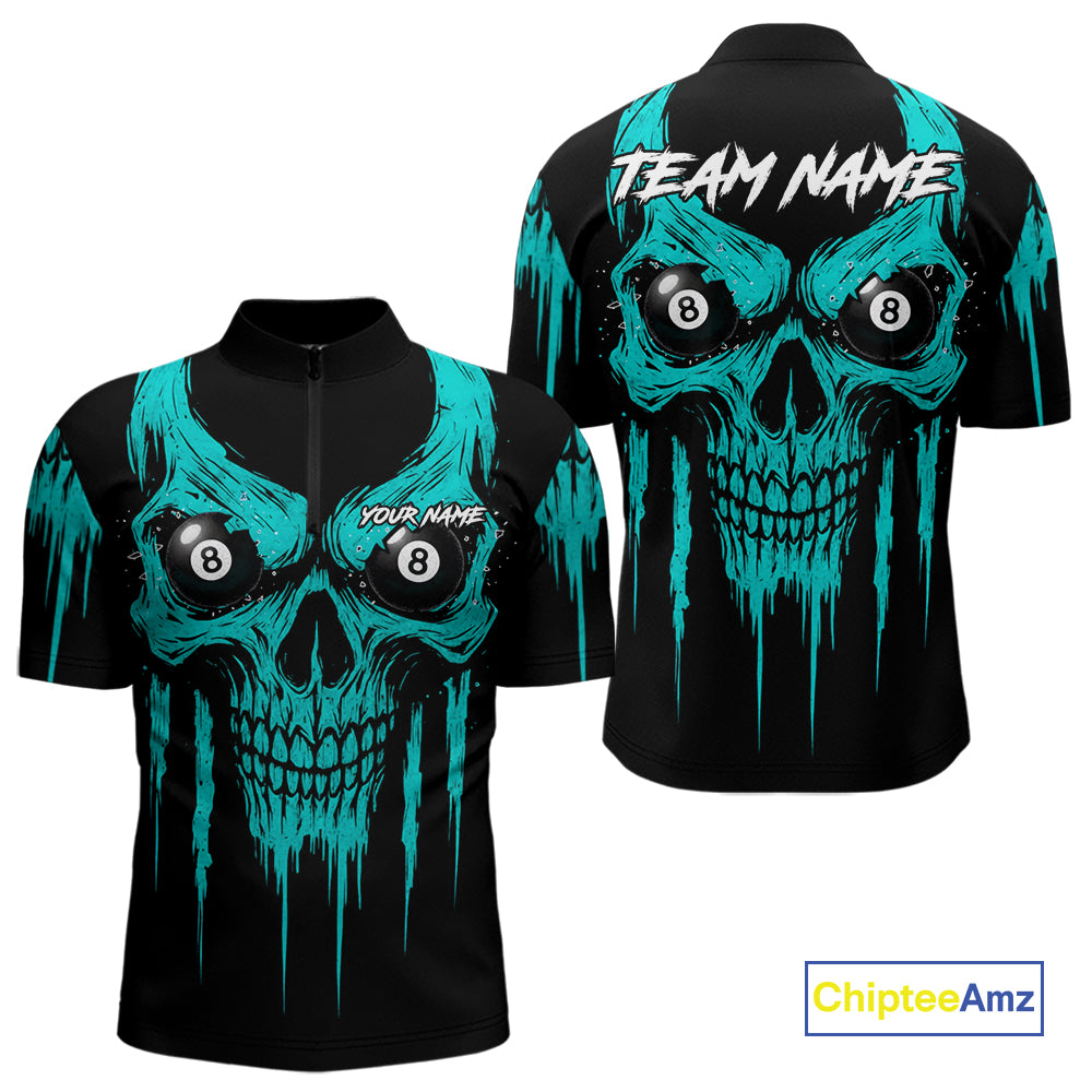 Turquoise Grunge Skull Billiard Jersey For Men Custom 8 Ball Pool Billiard Shirt Polo & 1/4 Zip TDM5074