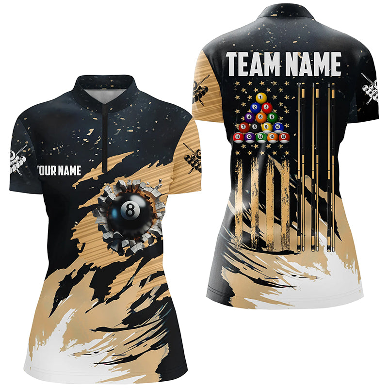 Customized Grunge American Flag 8 Ball Pool Women Billiard Shirts, Patriotic Pool Player Shirts TDM1721