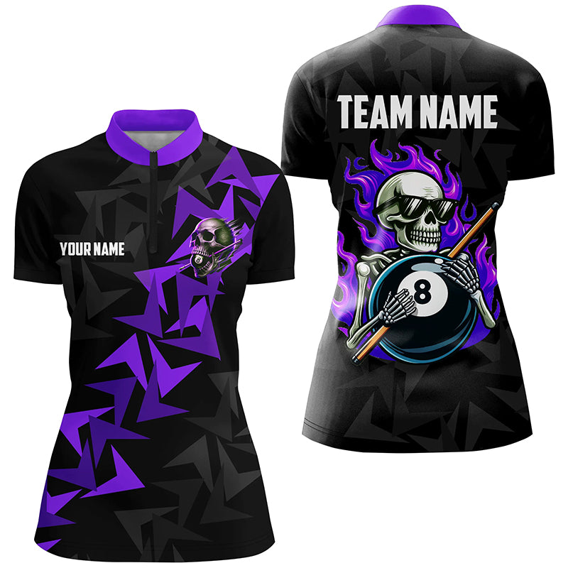 Funny Skeleton With 8 Ball Pool Custom Women Billiard Shirts, Cool Purple Billiard Jerseys Shirts TDM1903