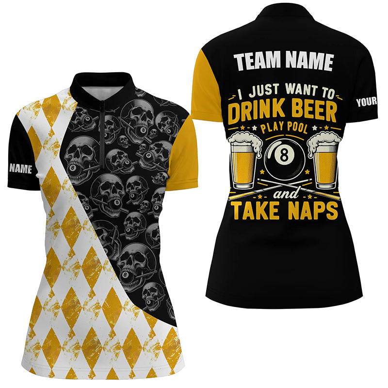 I Just Want To Drink Beer Billiard Shirt For Women Custom Yellow Argyle Skull Pattern Billiard Jersey TDM2091