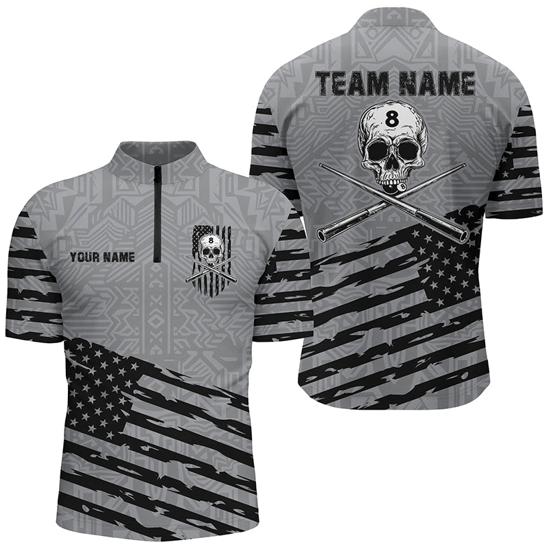 Personalized Grey US Flag Skull Billiard Shirts For Men Custom Patriotic Billiard Pool Jerseys TDM2220