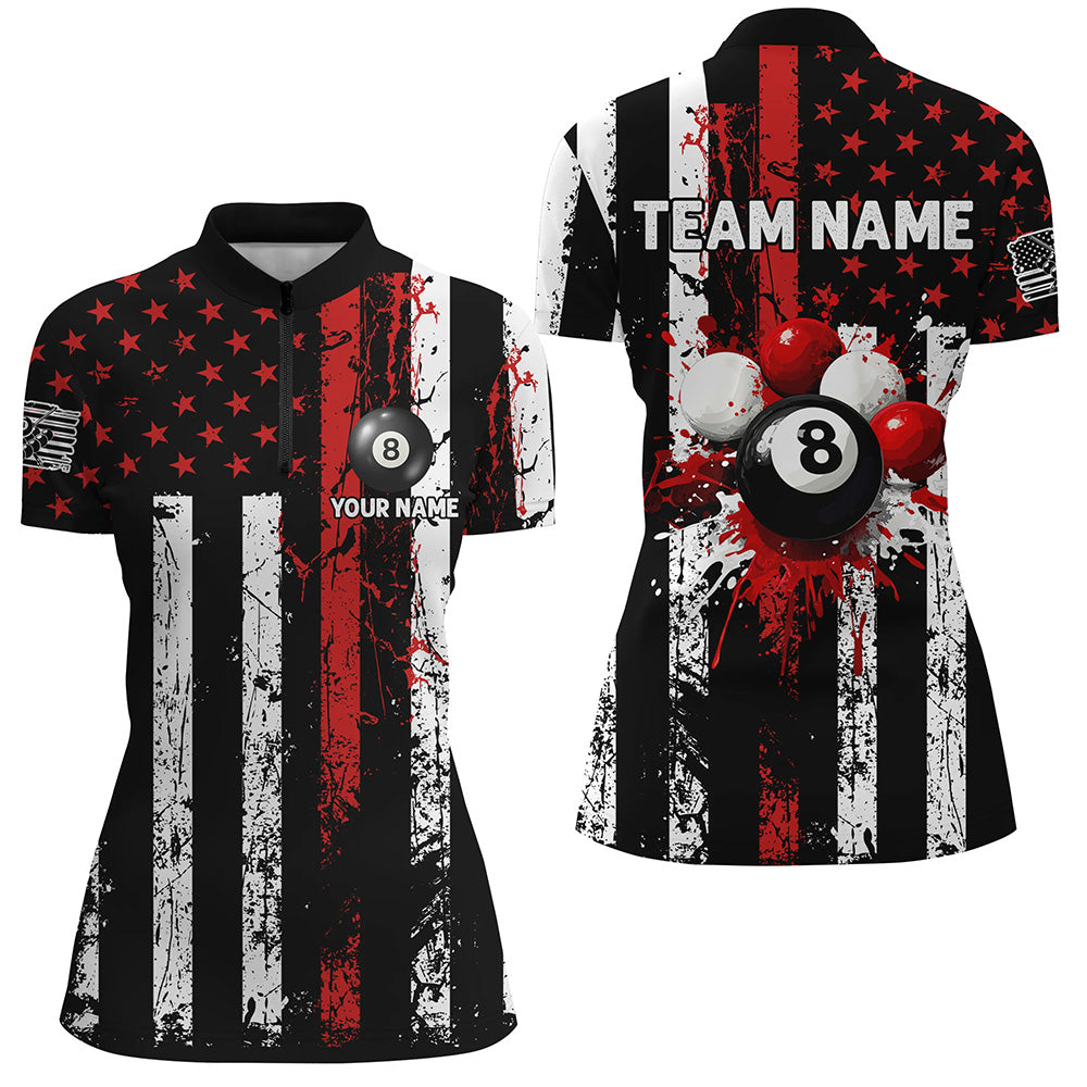 Red Grunge US Flag Patriotic Billiard Shirts For Women Custom Splash Paint 8 Ball Billiard Jerseys TDM2246