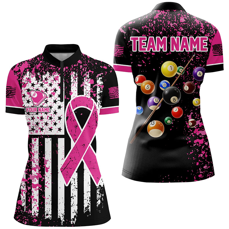 Pink Ribbon Black Grunge American Flag Custom Billiard Shirt For Women, Breast Cancer Billiard Jersey TDM2366