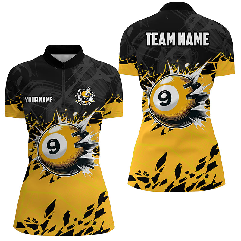Funny Yellow Black 9 Ball Pool Crack Custom Billiard Shirts For Women, 9 Ball Billiard Jerseys TDM2416