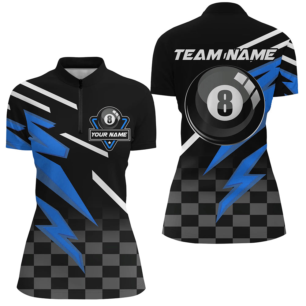 Customized 8 Ball Pool Tournament Billiards Shirts For Women, Blue And Black 8 Ball Billiard Jerseys TDM2641