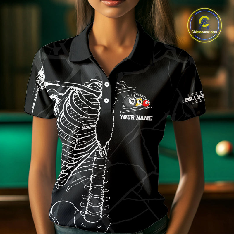 White Skeleton Custom Black Grunge Billiard Shirts For Women, Funny Billiard Jerseys Short Sleeve TDM2723