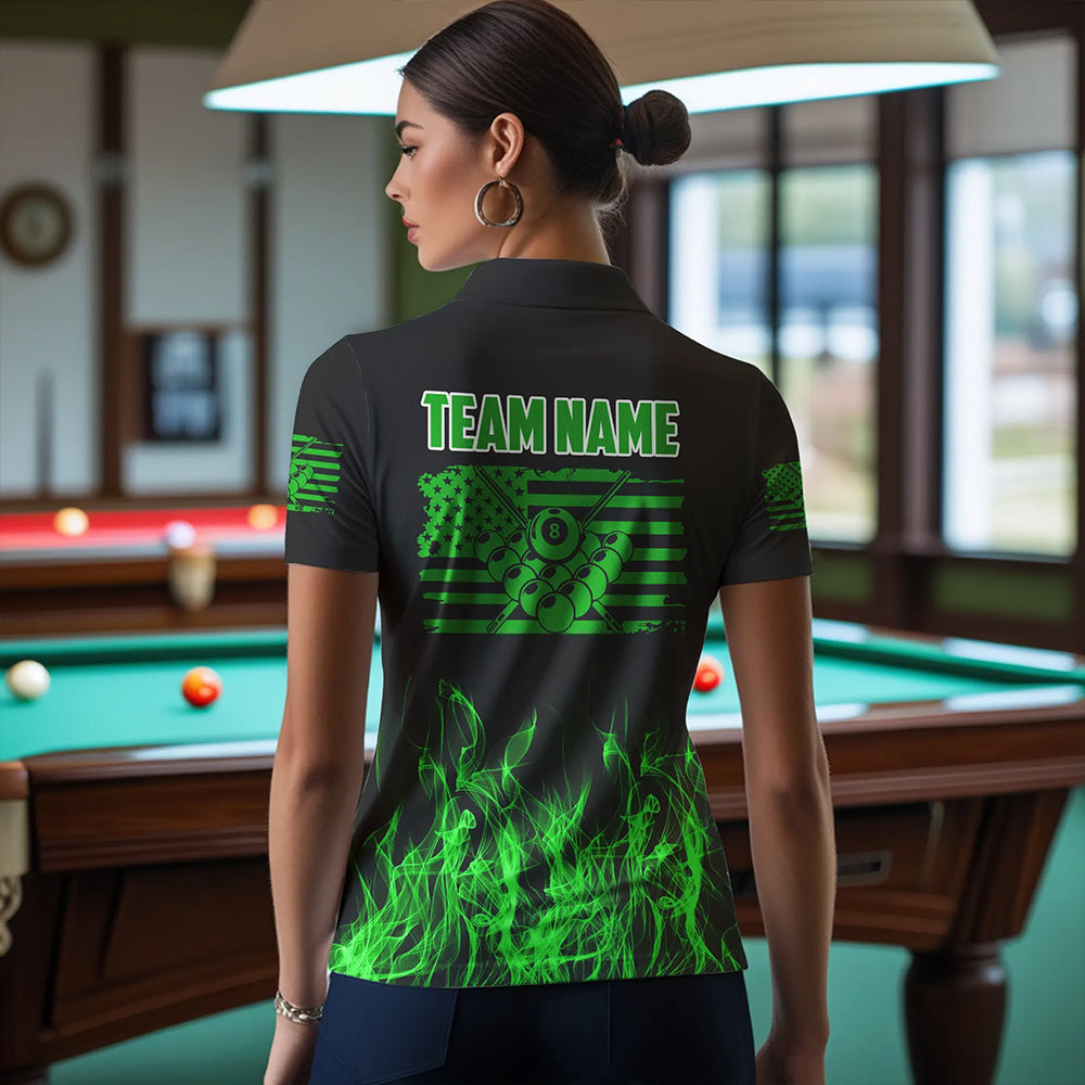 3D Green Flaming American Flag Women Billiard Shirt Custom Patriotic Pool Player Billiard Jersey TDM3452