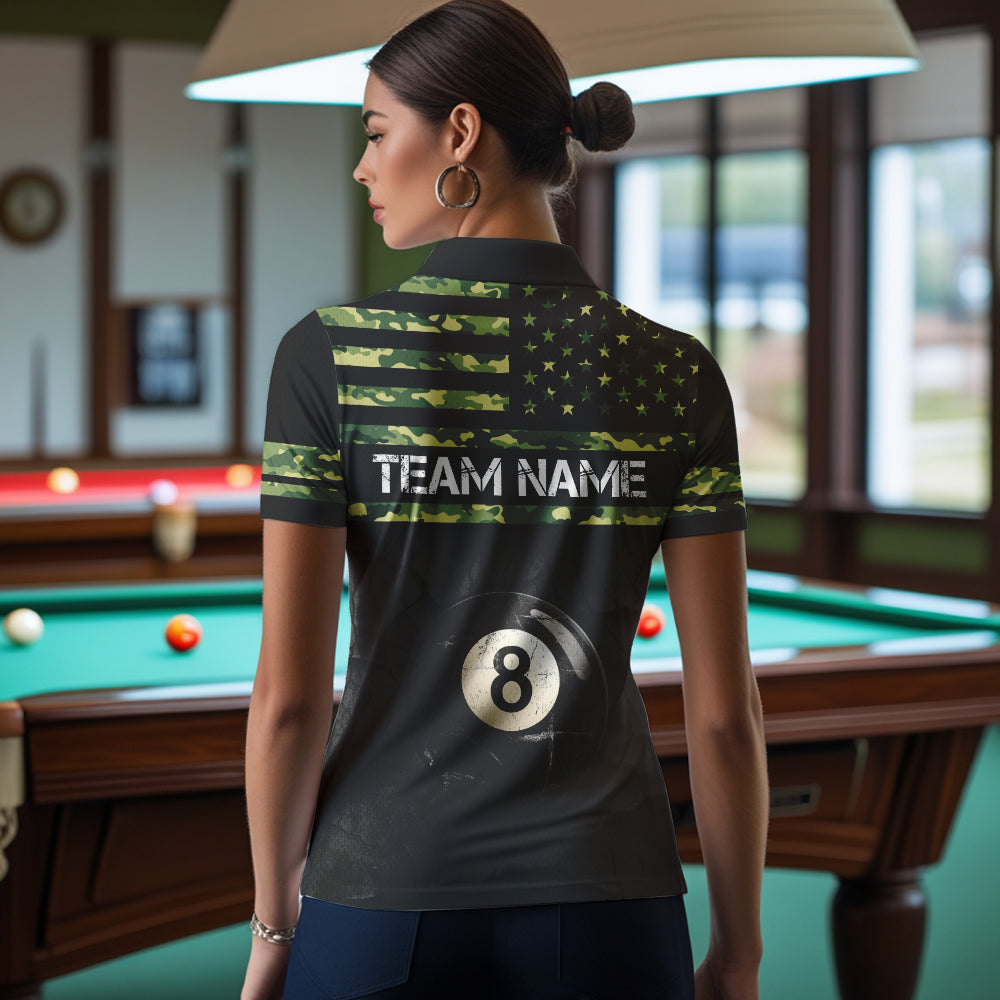 Customized Retro 8 Ball Pool Green Camo US Flag Billiard Shirts For Women, Patriotic Billiard Jerseys TDM3566