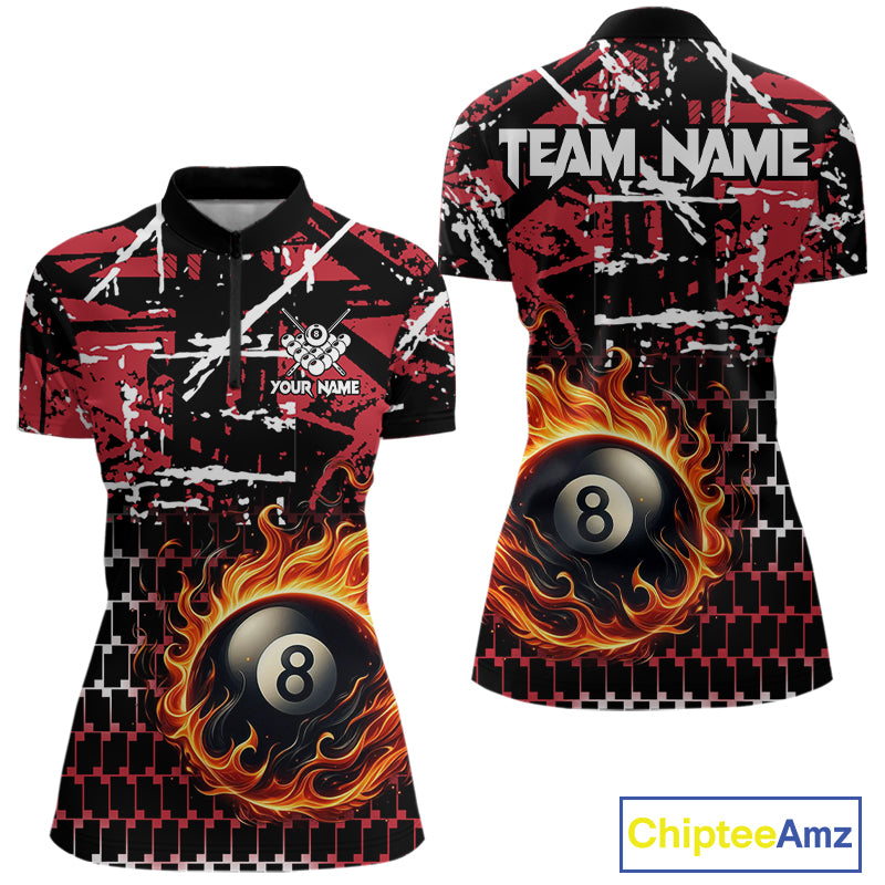 Grunge Black And Red Flaming 8 Ball Pool Women's Billiard Shirts Custom Billiard Jerseys Team Shirts TDM3833