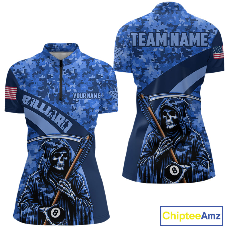 Personalized Death Skeleton Blue Camo Billiard Shirts For Women Custom Military Billiard Jerseys TDM3985