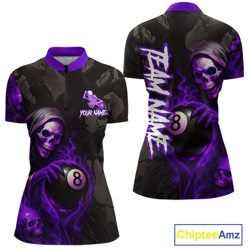 Grim Reaper Custom Flame 8 Ball Pool Billiard Shirt For Women, Purple Black Billiard Team Jersey TDM4121