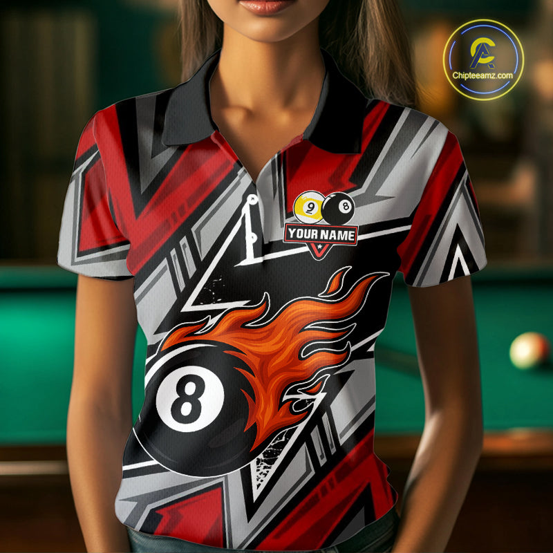 Personalized Women's Billiard Shirts, Flame 8&9 Ball Custom Red Zig-Zag Billiard Team Jerseys TDM4137