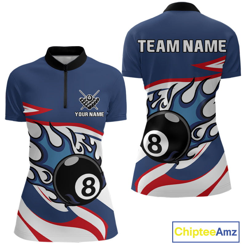 Red, White And Blue 8 Ball Flame Billiard Shirt For Women Custom Billiard Team Jersey Polo & 1/4 Zip TDM4202