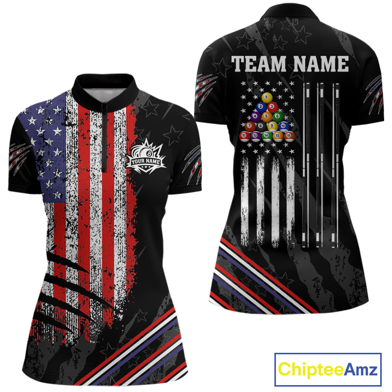 Personalized American Flag Billiard Shirt For Women Custom Grunge Vintage Patriotic Pool Team Jersey TDM4499