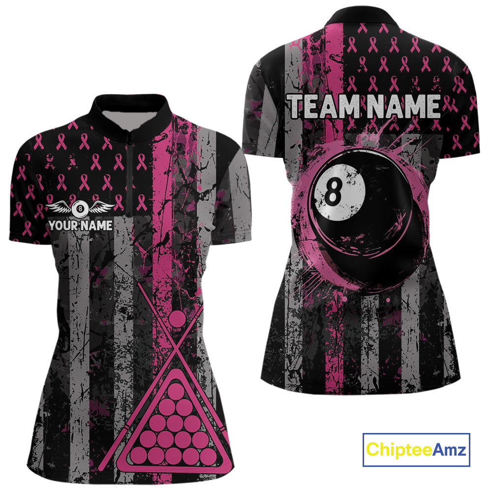 Custom Pink Ribbon Grunge US Flag Billiard Shirt For Women, Breast Cancer 8 Ball Pool Team Jersey TDM4500
