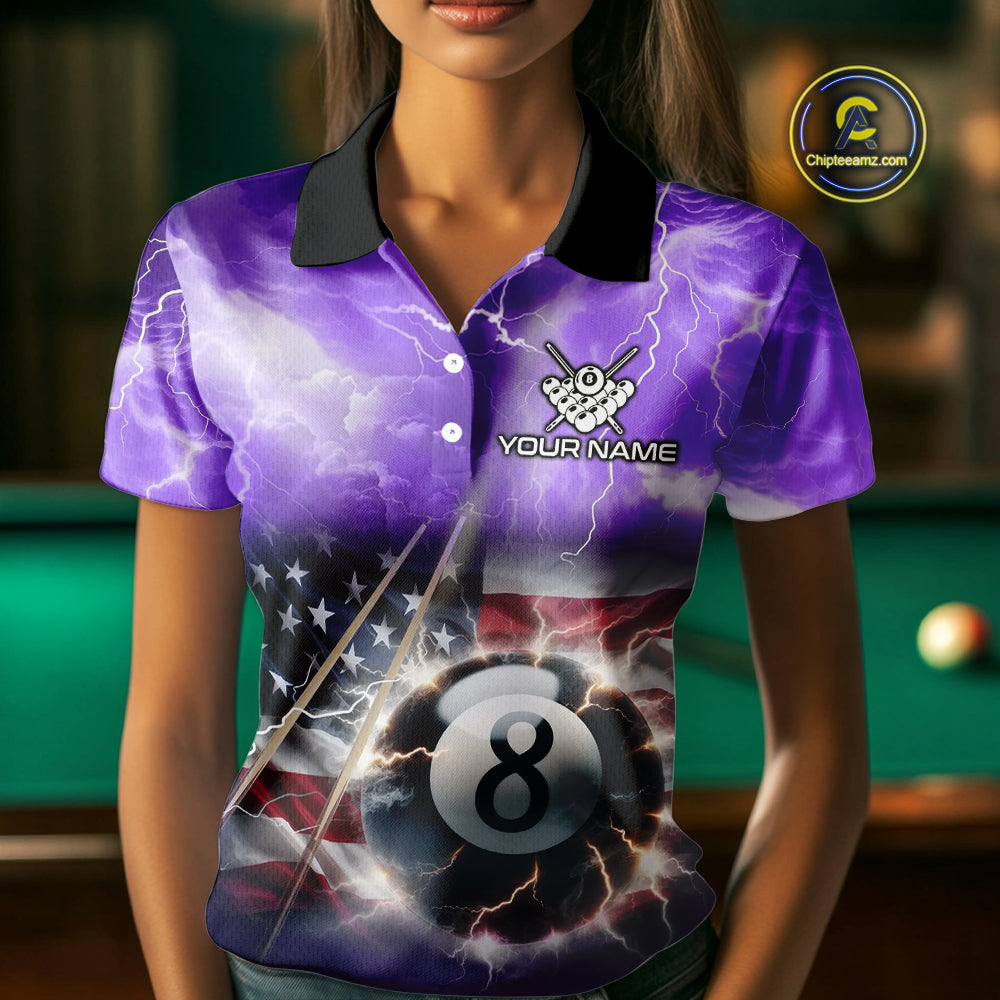 Purple American Flag Thunder Lightning 8 Ball Billiard Shirt For Women Custom Pool Team Jersey TDM4611