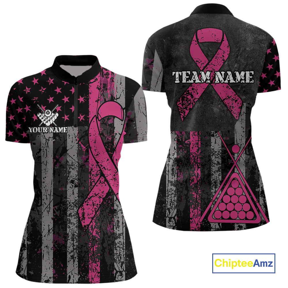 Custom Pink Ribbon Grunge US Flag Billiard Shirt For Women, Patriotic Breast Cancer Pool Team Jersey TDM4624