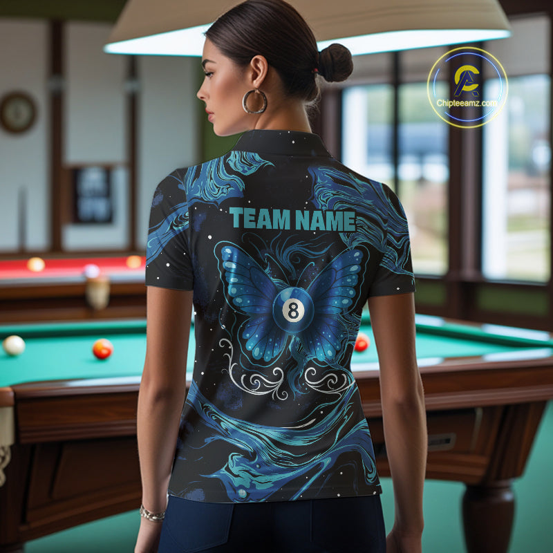 Custom Teal Blue Marble Billiard Shirt For Women, 8 Ball Butterfly Pool Team Jersey Polo & 1/4 Zip TDM4776