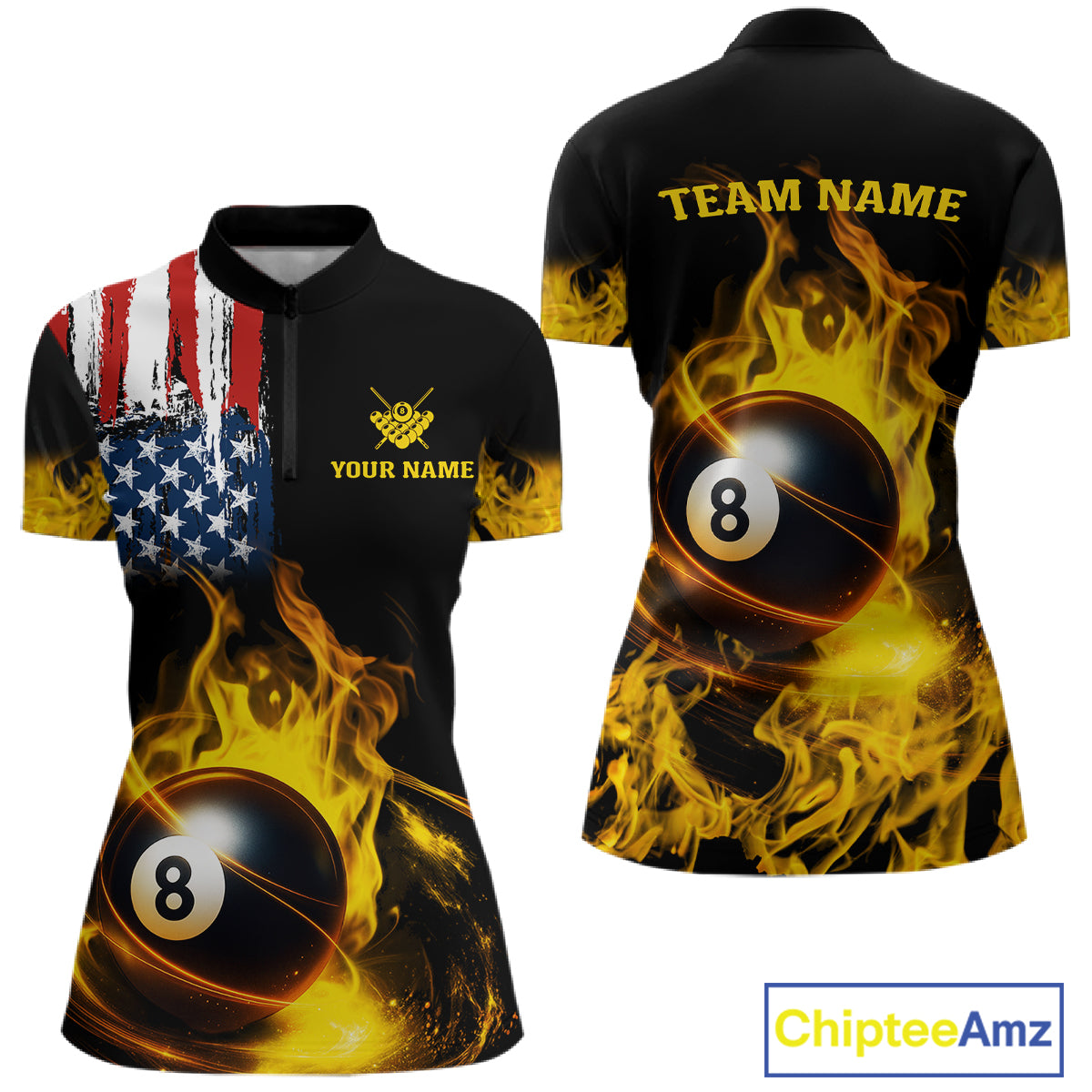 Yellow Flaming American Flag 8 Ball Billiard Shirt For Women Custom Patriotic Pool Team Jersey TDM4843