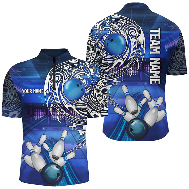 Personalized Blue tribal pattern custom bowling Polo, 1/4 zip shirts for men, cool bowling jerseys NQS8339