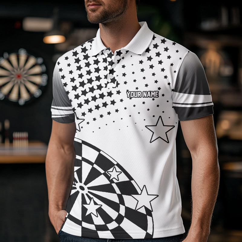 Personalized Black and White Stars Darts Polo, Quarter Zip Shirt For Men Custom Dart Team Jerseys NQS9511