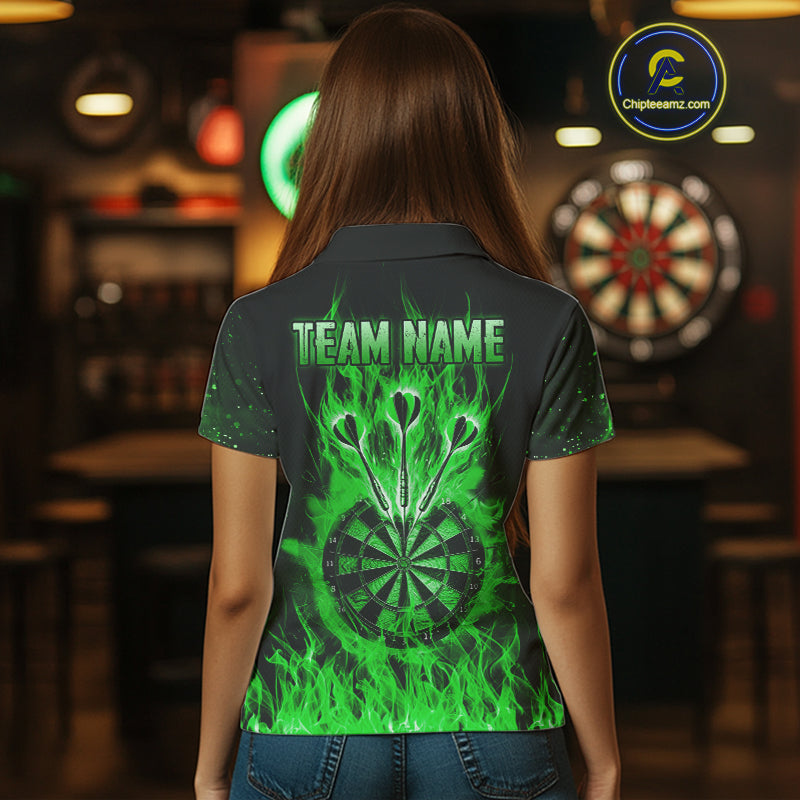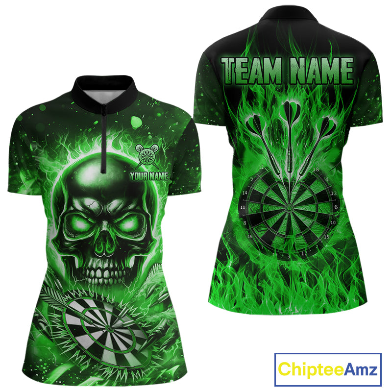 Green Flame Skull Dartboard Shirt For Women Custom Darts League Team Jersey Polo & Quarter Zip TDM5010