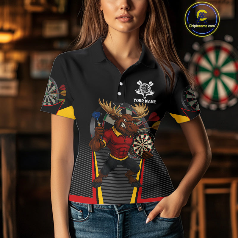 Black and Red Funny Moose Darts Polo, Quarter Zip Shirts For Women Custom Darts Team Jerseys NQS11065
