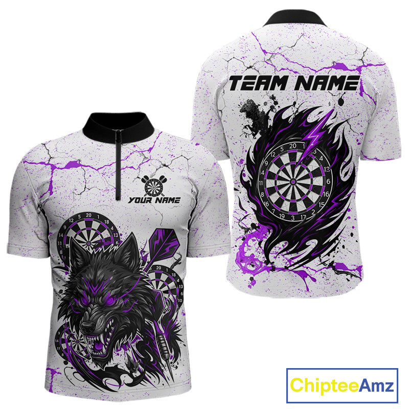 Personalized White Grunge Wolf Darts Shirt For Men Custom Darts Team Jersey Polo & 1/4 Zip|Purple TDM5282