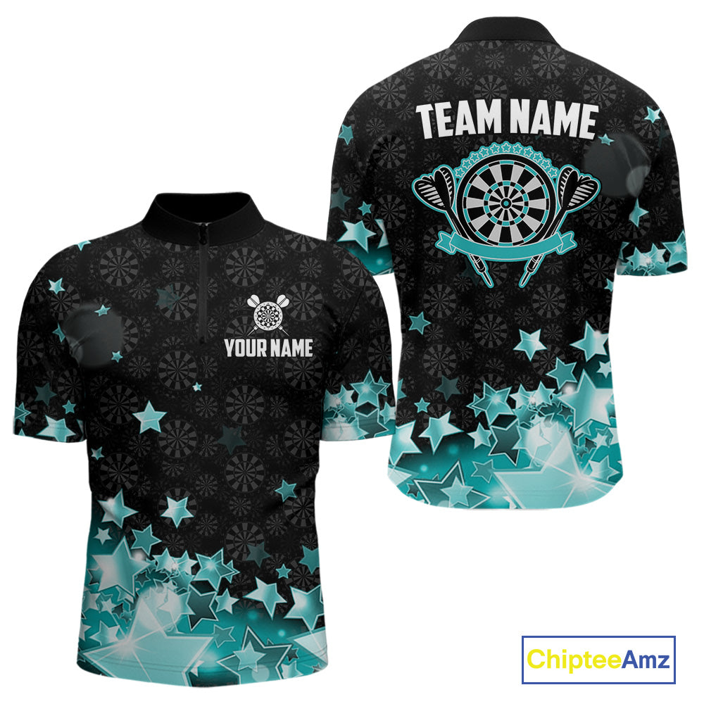 Funny Custom Dart Shirt For Men, Turquoise Black Glowing Star Pattern Darts Polo & Quarter Zip TDM5325