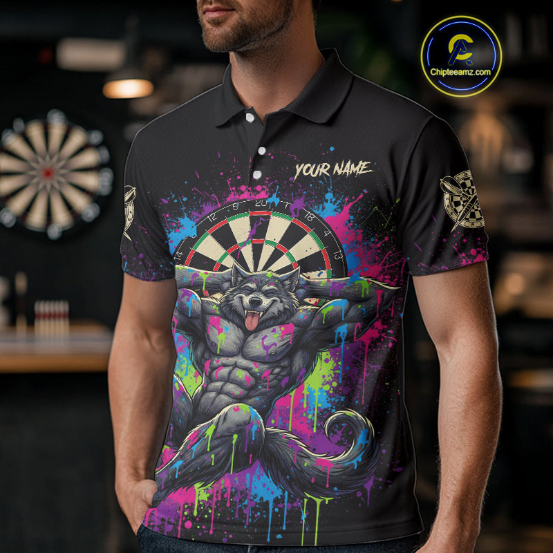 Colorful Splatter Funny Wolf Dartboard Custom Darts Polo Shirt For Men Dart Team Gifts NYN2001