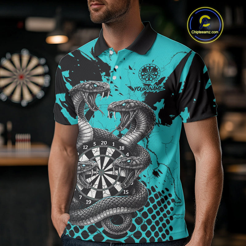 Black And Turquoise Multi Cobra Grunge Dartboard Custom Men Polo Darts Shirt Dart Gifts NYN2017