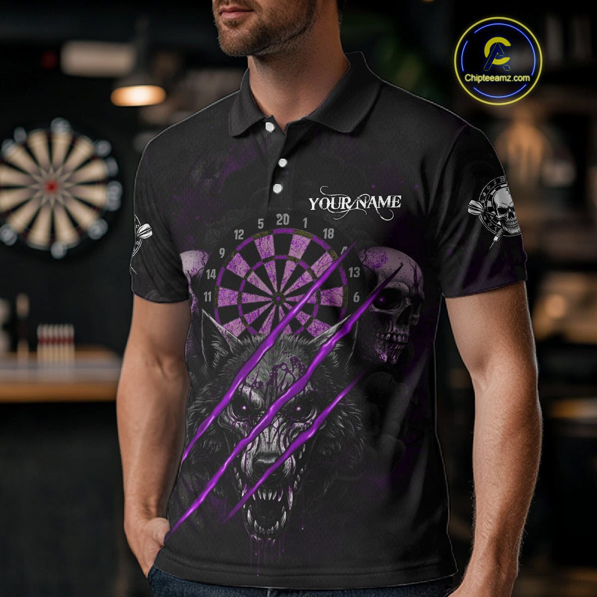 Purple Blood Scratch Wolf Men Darts Polo Shirt Custom Name & Team Skull Dart League Shirt NYN2055