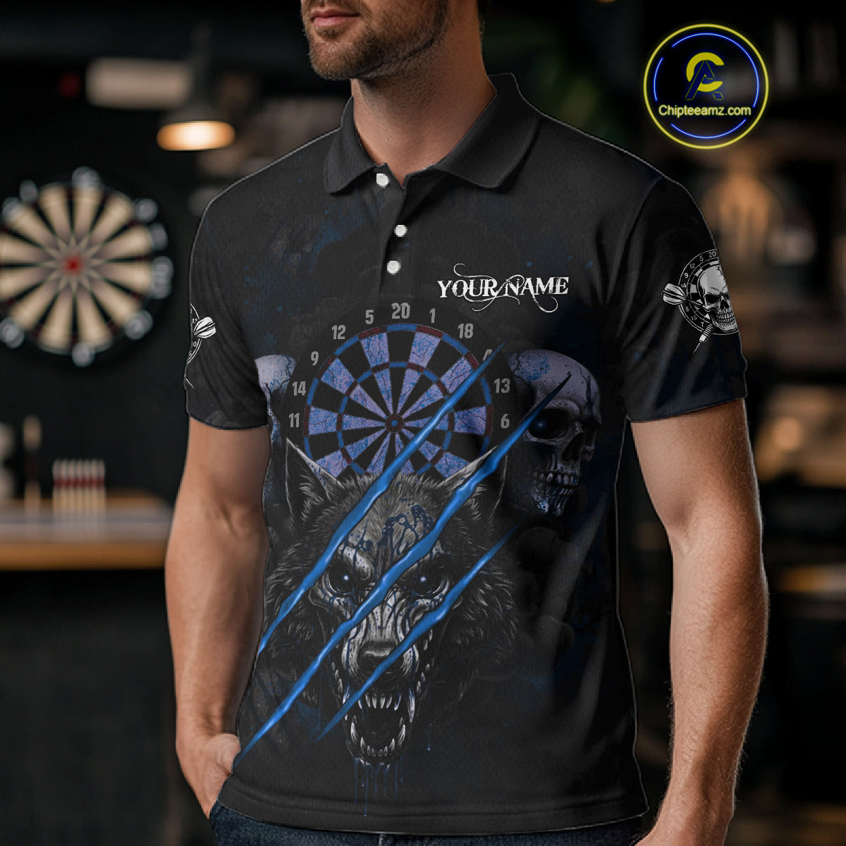 Blue Blood Scratch Wolf Men Darts Polo Shirt Custom Name & Team Skull Dart League Shirt NYN2056