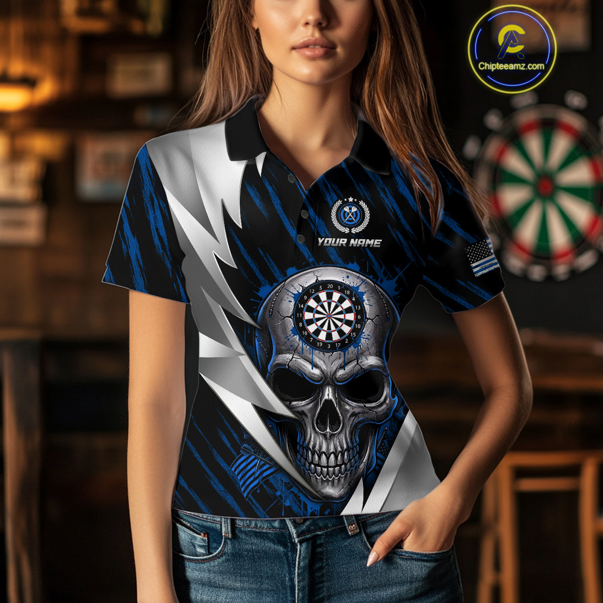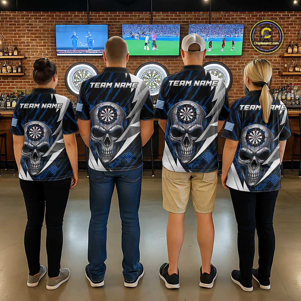 Silver Skull Blue Grunge US Flag Women Darts Polo Shirt Custom Name Dart League Jerseys NYN2063