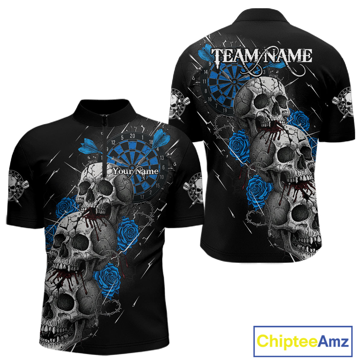Custom Blue Roses Blood Dripping Skull Dartboard Men Darts Quarter-Zip Shirt Dart Jerseys NYN1926