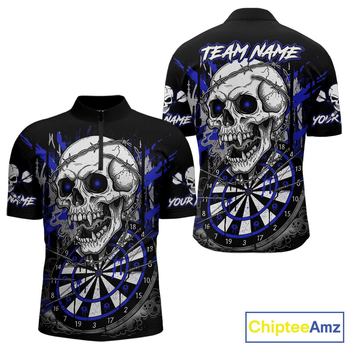 Custom Blue Grey Skull Barbed Wire Dartboard Grunge Darts Quarter-Zip Shirt For Men Dart Gifts NYN1970