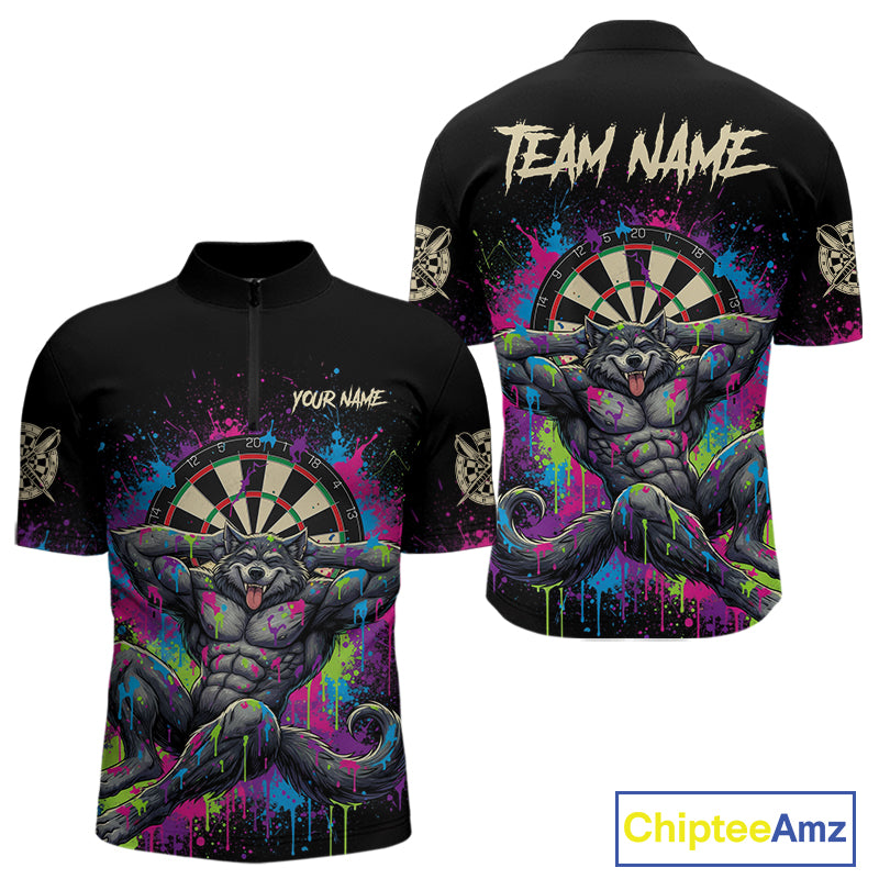 Colorful Splatter Funny Wolf Dartboard Custom Darts Quarter-Zip Shirt For Men Dart Team Gifts NYN2001