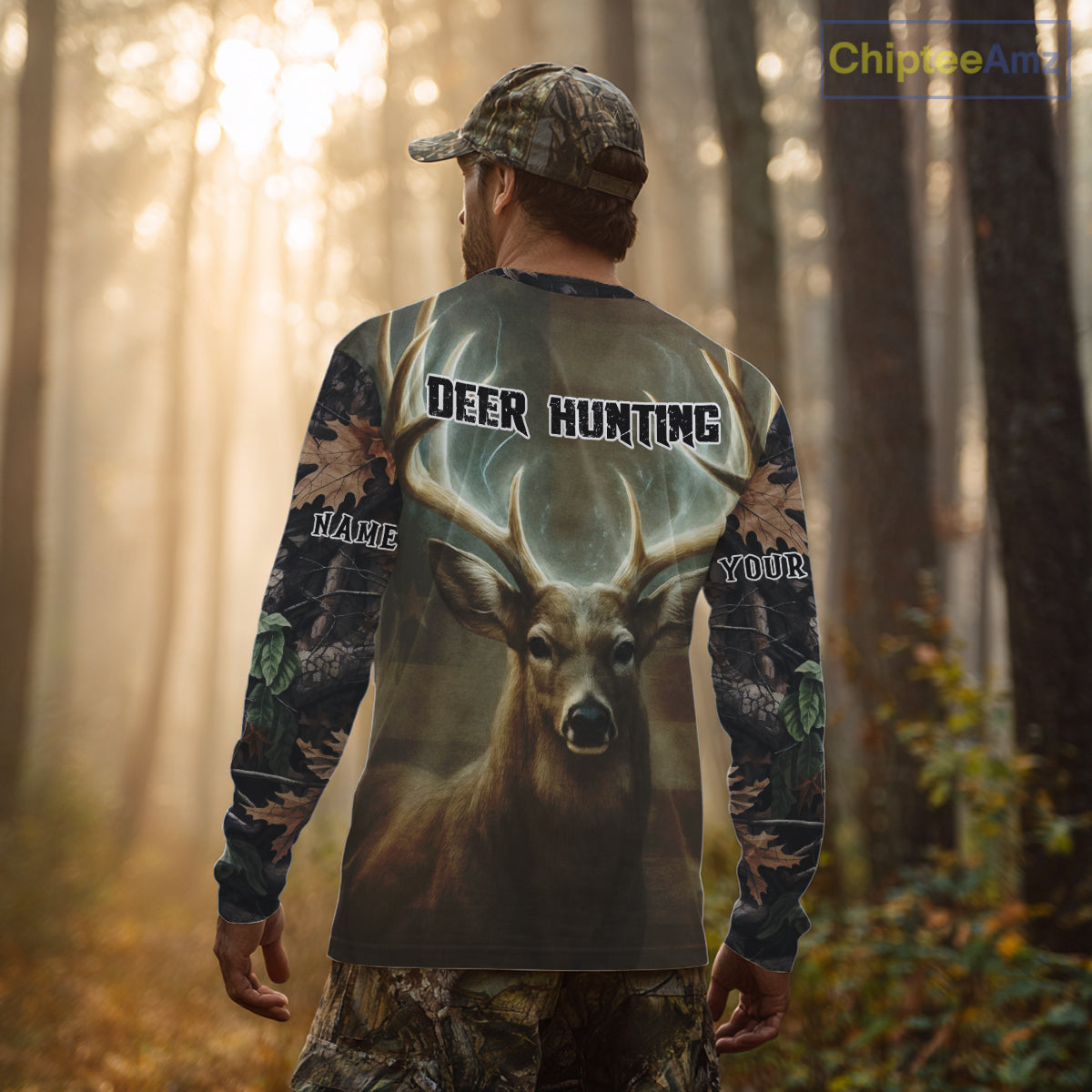 Deer Hunting Hoodie – American Flag Camo Long Sleeve Shirt with Buck Head Graphic