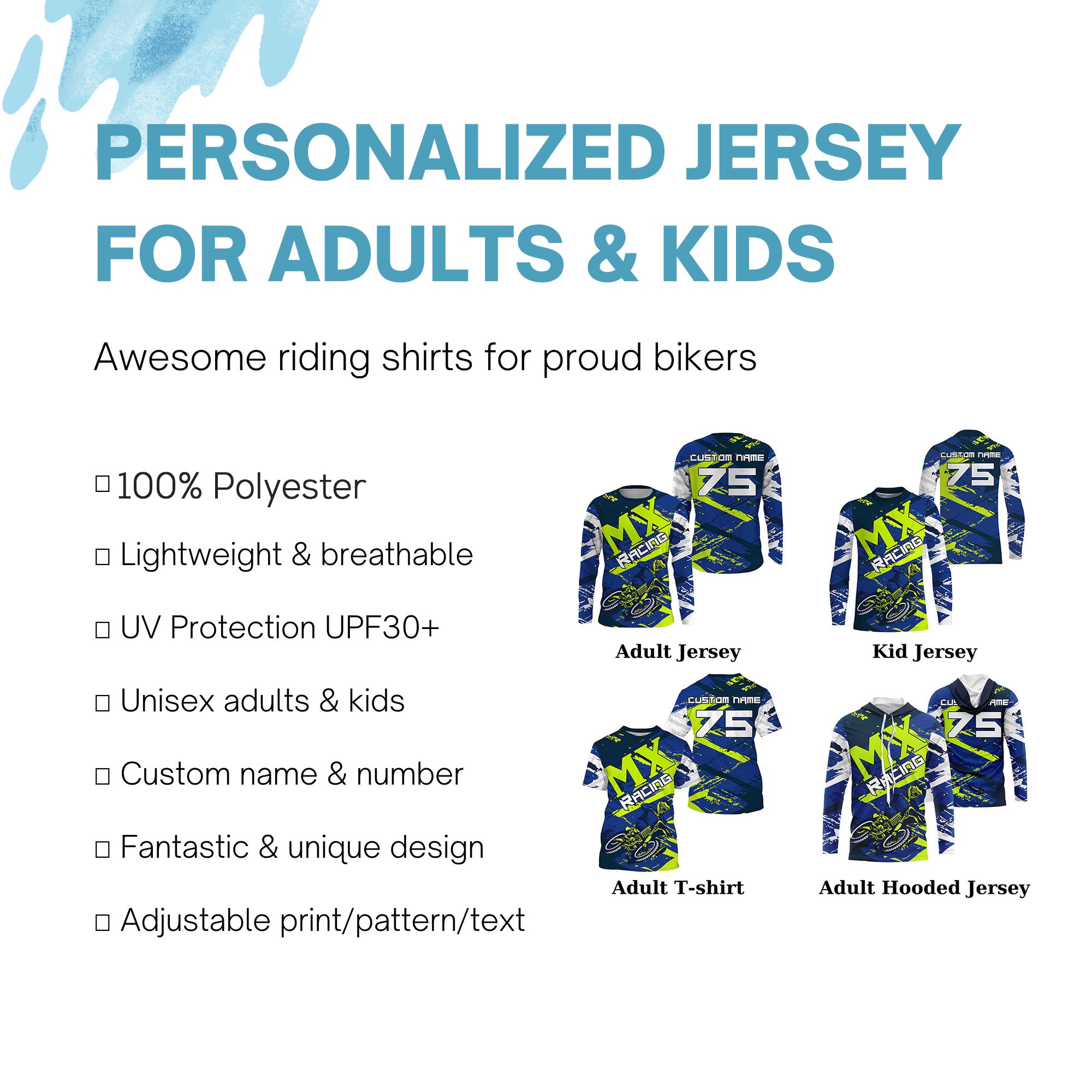 • PERSONALIZED RIDING JERSEY: This super cool shirt is exactly what all bikers are looking for. Add your name/number to make it a unique one that bears your own imprints.