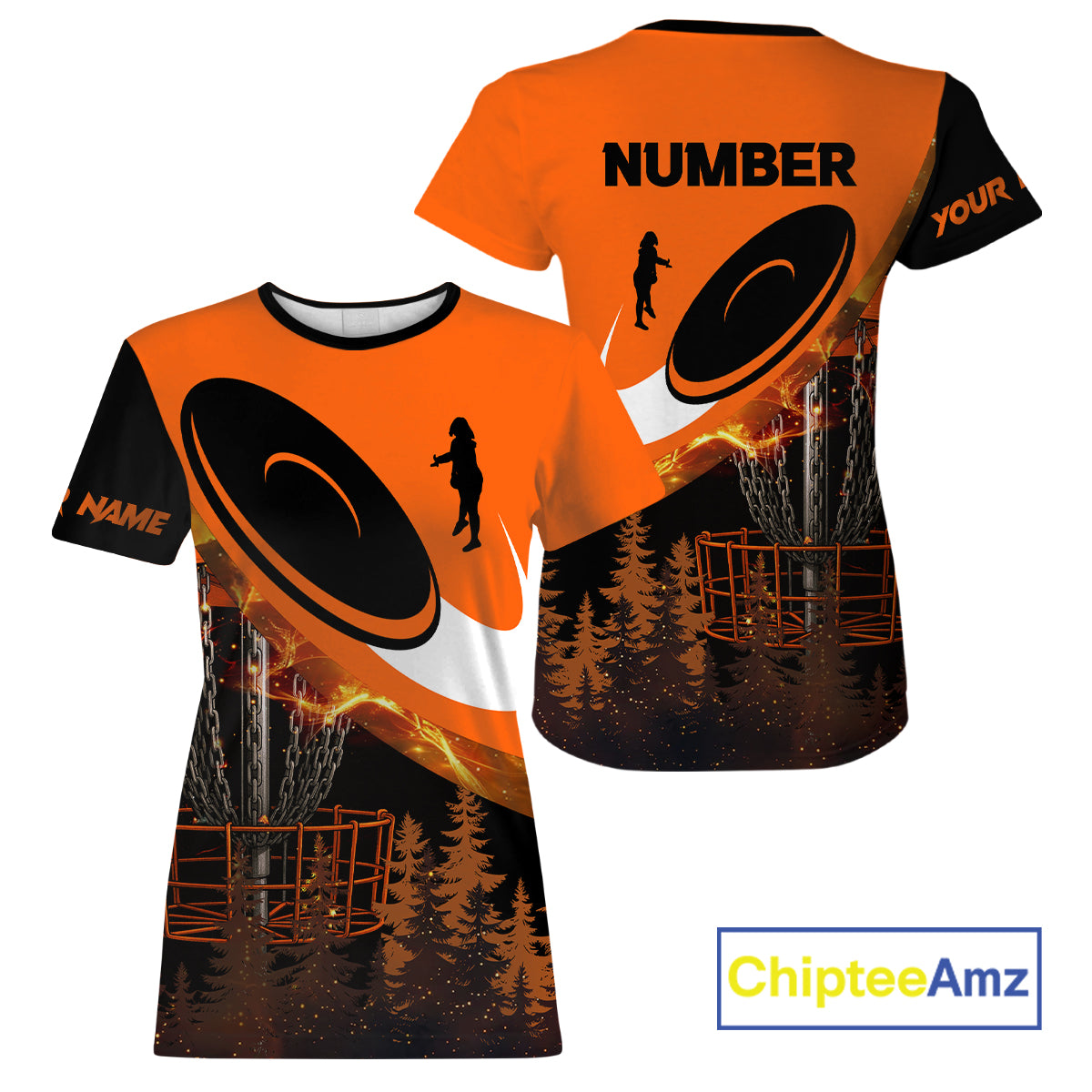 Black and Orange Disc golf T-Shirts For Women Custom Disc Golf basket forest tree, Disc Golfer Gift NQS10820