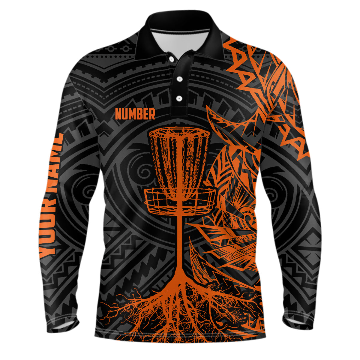 Orange tribal Mens disc golf polo shirt custom black disc golf basket jersey team mens disc golf shirt NQS7986