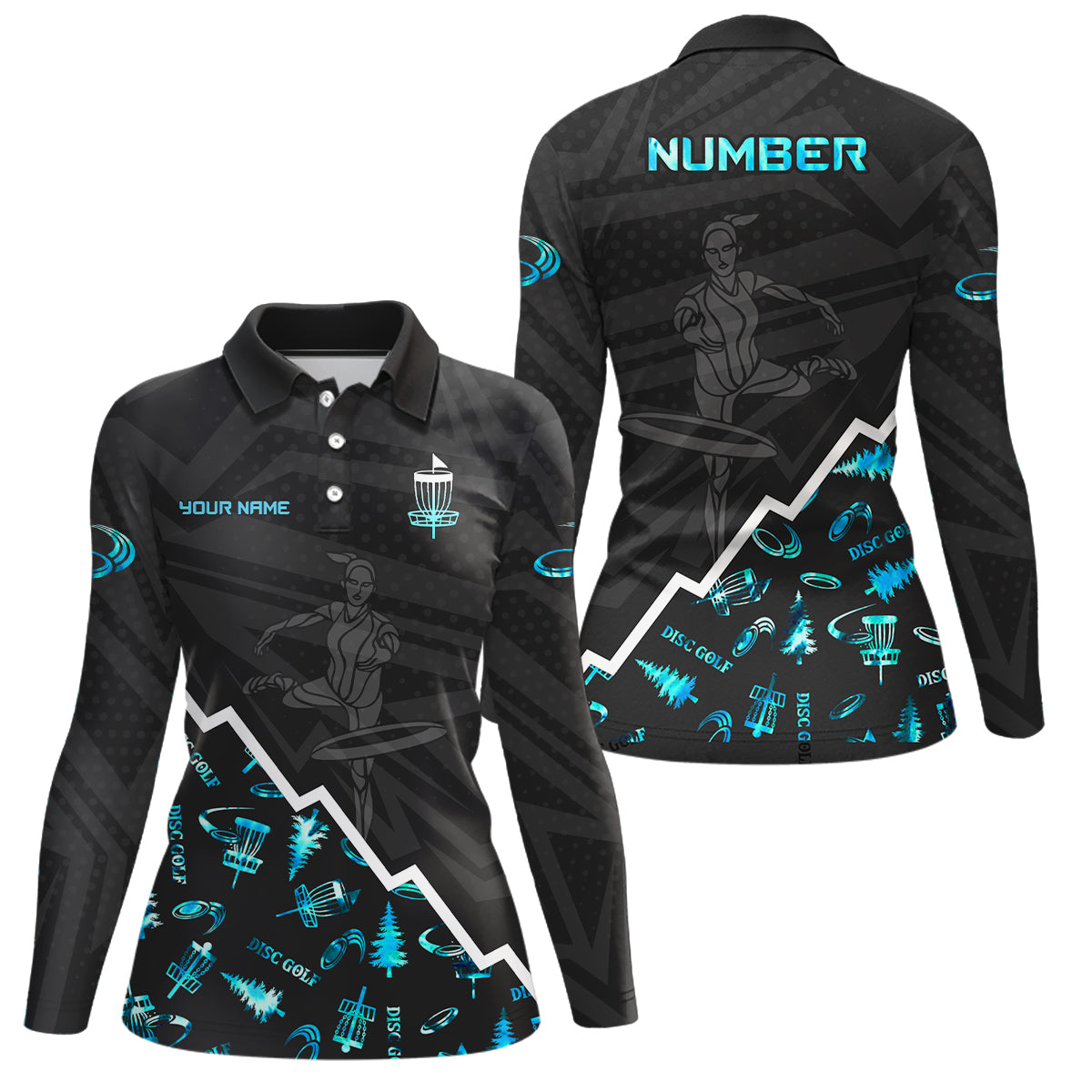 Blue Neon Black Womens Disc Golf Polo Shirts Custom Name And Number Disc Golf Gifts For Women TY1