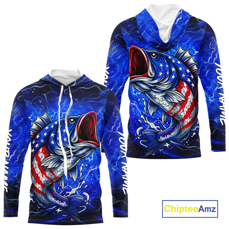 American Flag Largemouth Bass Fishing Custom patriotic Bass performance fishing apparel | Blue NQS11060