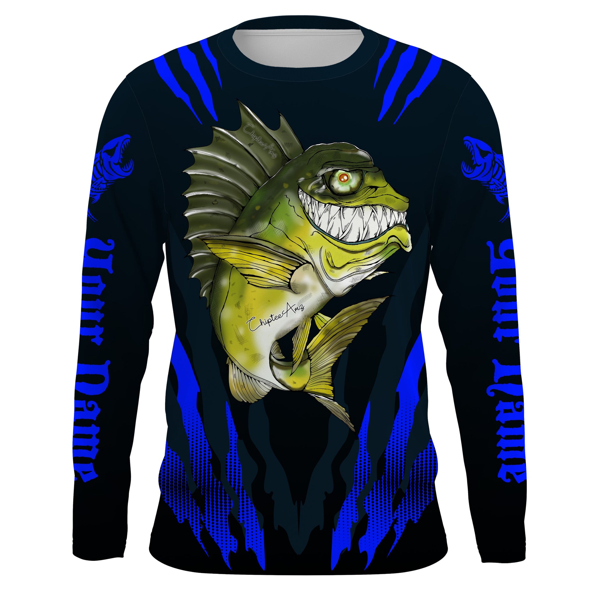 Angry Bass Fishing Custom Long sleeve Fishing Shirts, Bass fish reaper fishing jerseys | blue IPHW3375