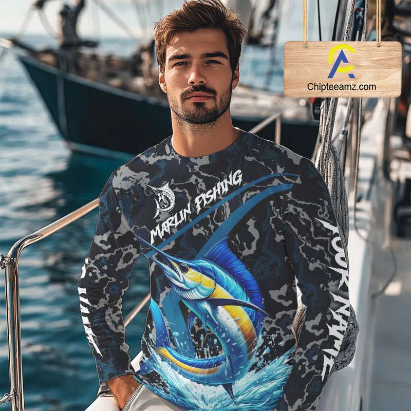 Custom Marlin Fishing Camo Long Sleeve Fishing Shirts, Personalized Marlin Fishing Team Jersey NQS10844