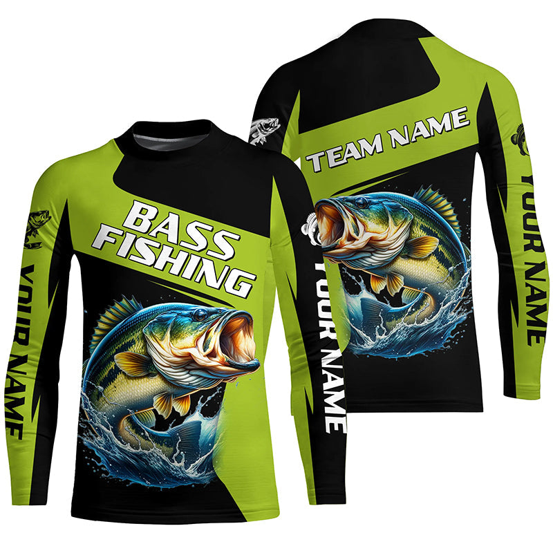 Black Green Bass fishing Custom Long Sleeve Tournament Fishing Shirts, Performance Bass Fishing Jersey NQS7475