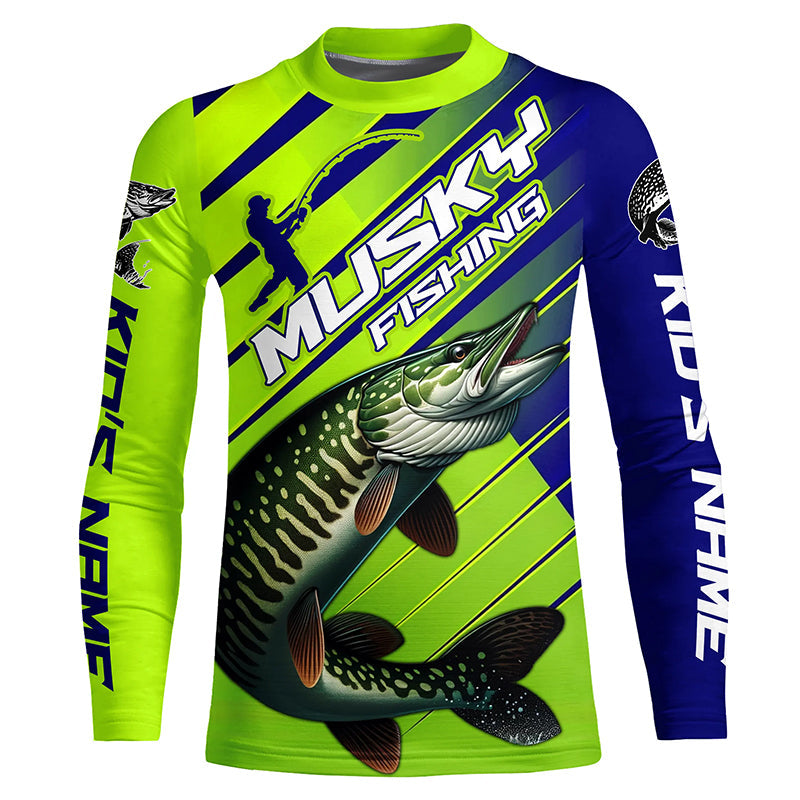 Musky Custom Long Sleeve Tournament Fishing Shirts, Muskie Fishing Jerseys | Green And Blue IPHW6211