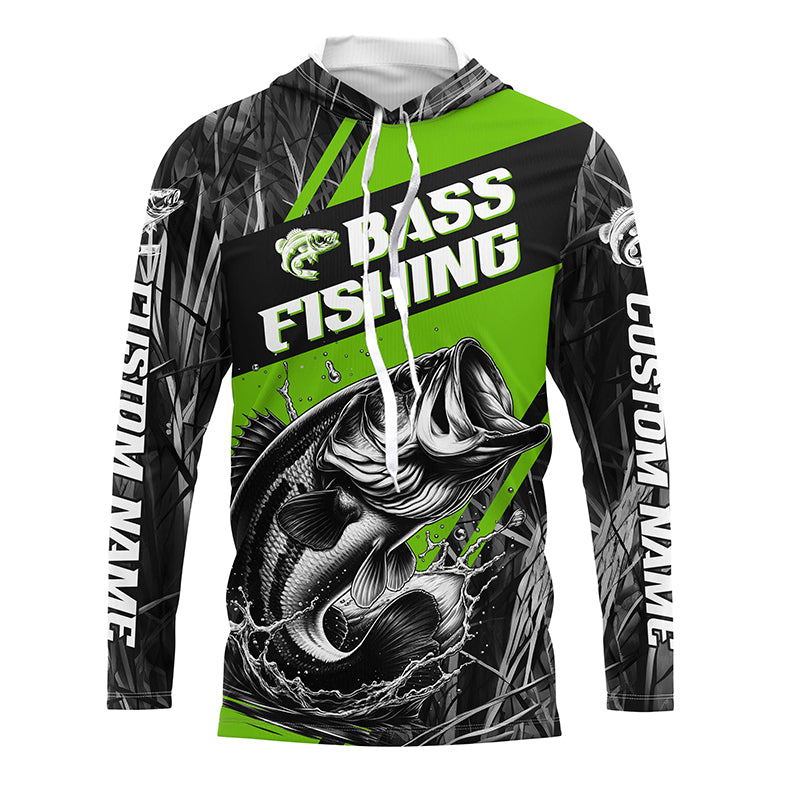 Black And Green Camo Bass Long Sleeve Tournament Fishing Shirts, Custom Bass Fishing Jerseys IPHW6684